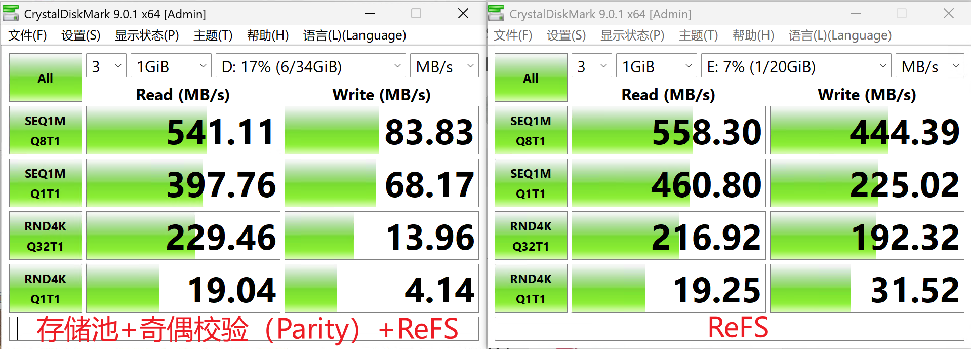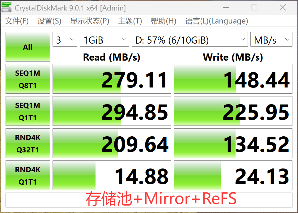存储池由3块19G的虚拟磁盘组成,右侧ReFS可以作为基准速度参考。